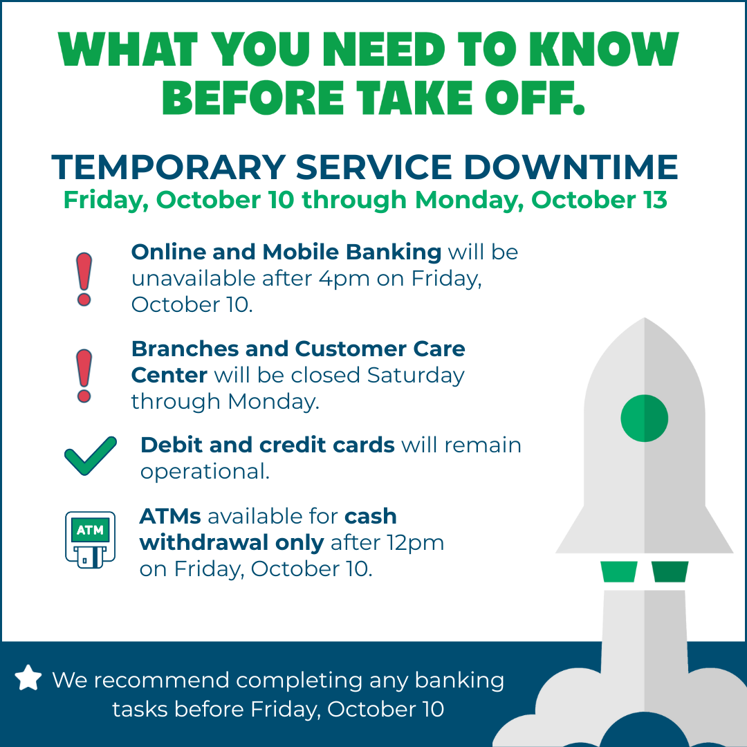 On October 10: ATMs will be withdrawal only after 12pm. Online and Mobile Banking will be unavailable after 4pm. Please check your balance if you intend to use your card(s) during our system downtime. Debit cards will remain operational.